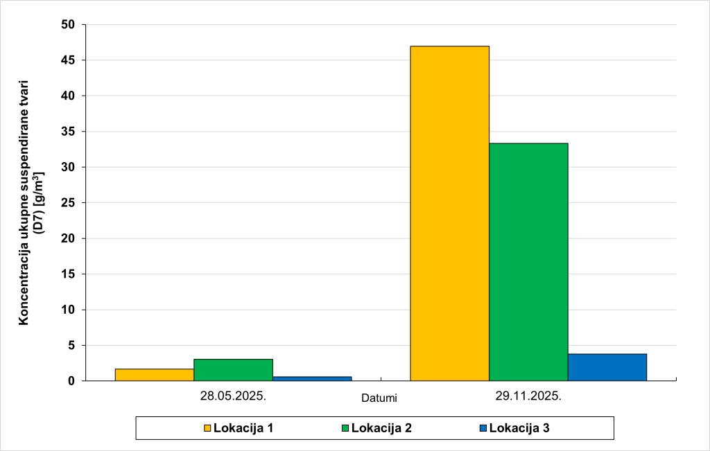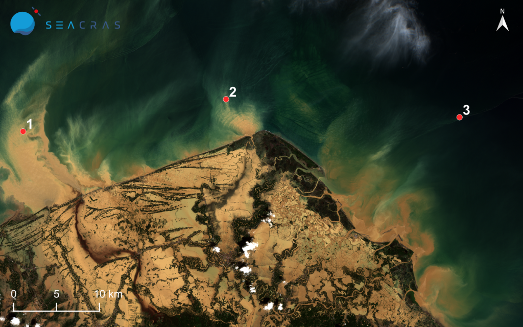 Na Slici 3. usporedili smo vrijednosti koncentracija suspendiranih sedimenata za tri (3) različite lokacije prije i nakon poplava. Rezultati pokazuju izrazito rasprostiranje sedimenata na tisućama četvornih kilometara okolnog mora, pri čemu su vrijednosti porasle i do 50 puta u odnosu na normalne, čak i na udaljenosti do 10 km od obale. To upućuje na promjenu velikih razmjera u bioraznolikosti i staništima ne samo na kopnu, već i u moru.